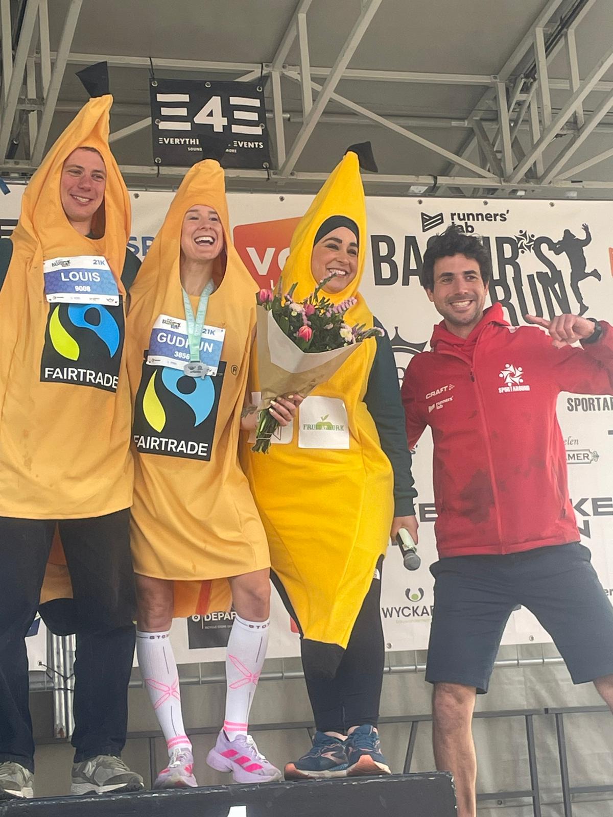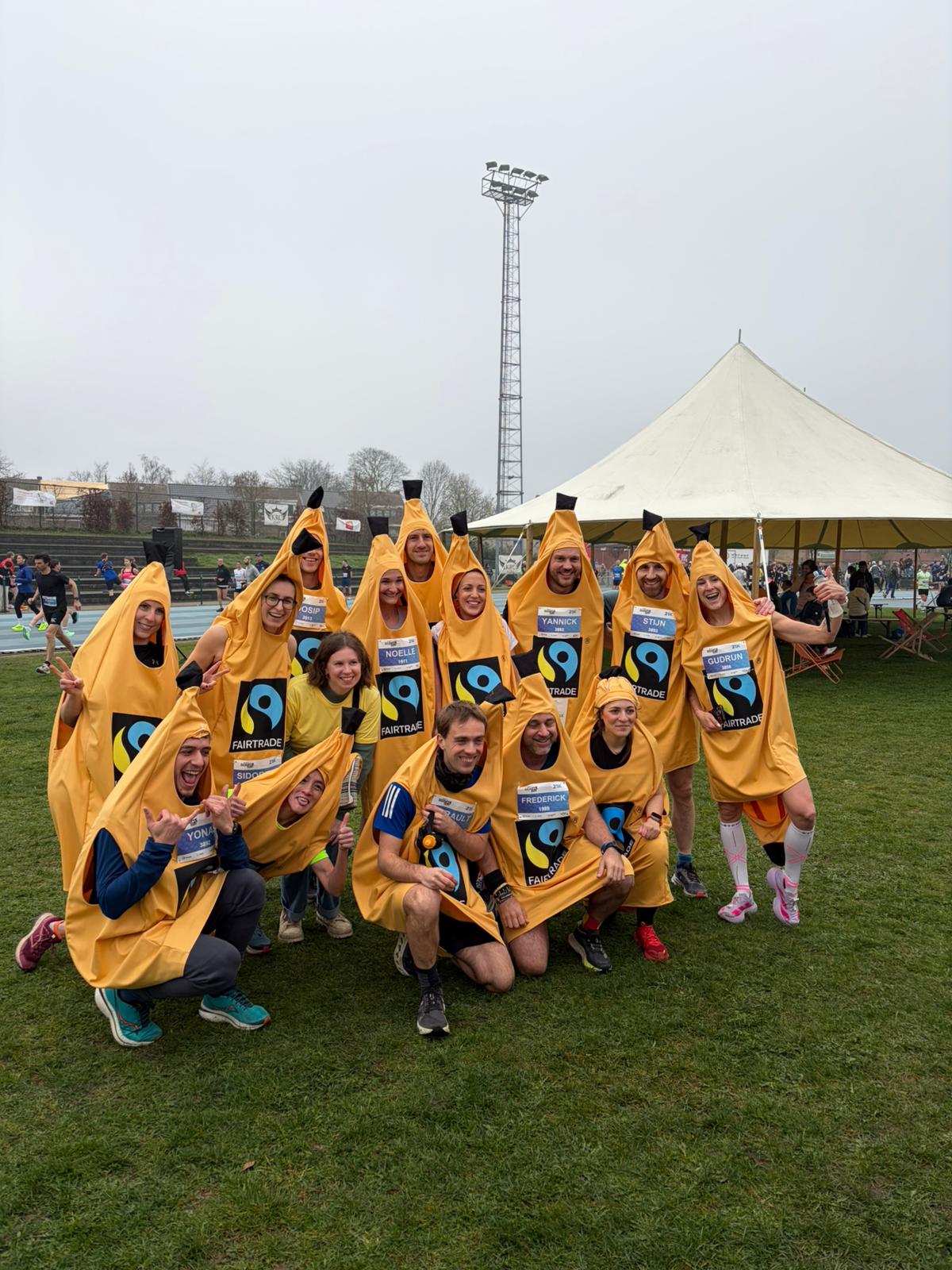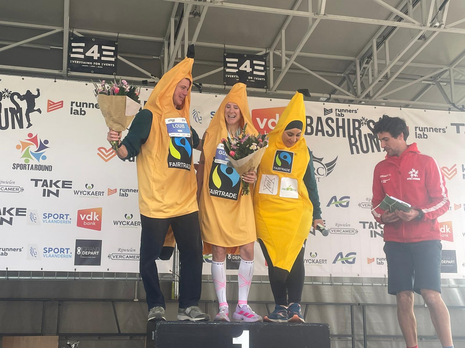 Op de Bashir’s Run in Gentbrugge was het vanmorgen uitkijken naar een unieke wereldrecordpoging: de snelste halve marathon ooit verkleed in een stuk fruit. Organisatoren Gent Fair Trade en Fairtrade Belgium trommelden met Louis Misplon en influencer Gudrun Hespel twee kanshebbers op om in Fairtrade bananenpak het WR bij de mannen en vrouwen te verbreken. En ze hielden zich aan hun belofte: Misplon en Hespel verpulverden de recordtijden, tot voordien 1:15:35 en 1:48:36. In totaal stonden meer dan 40 Fairtrade bananenlopers aan de start, waaronder ook influencer Samuel de Graef.