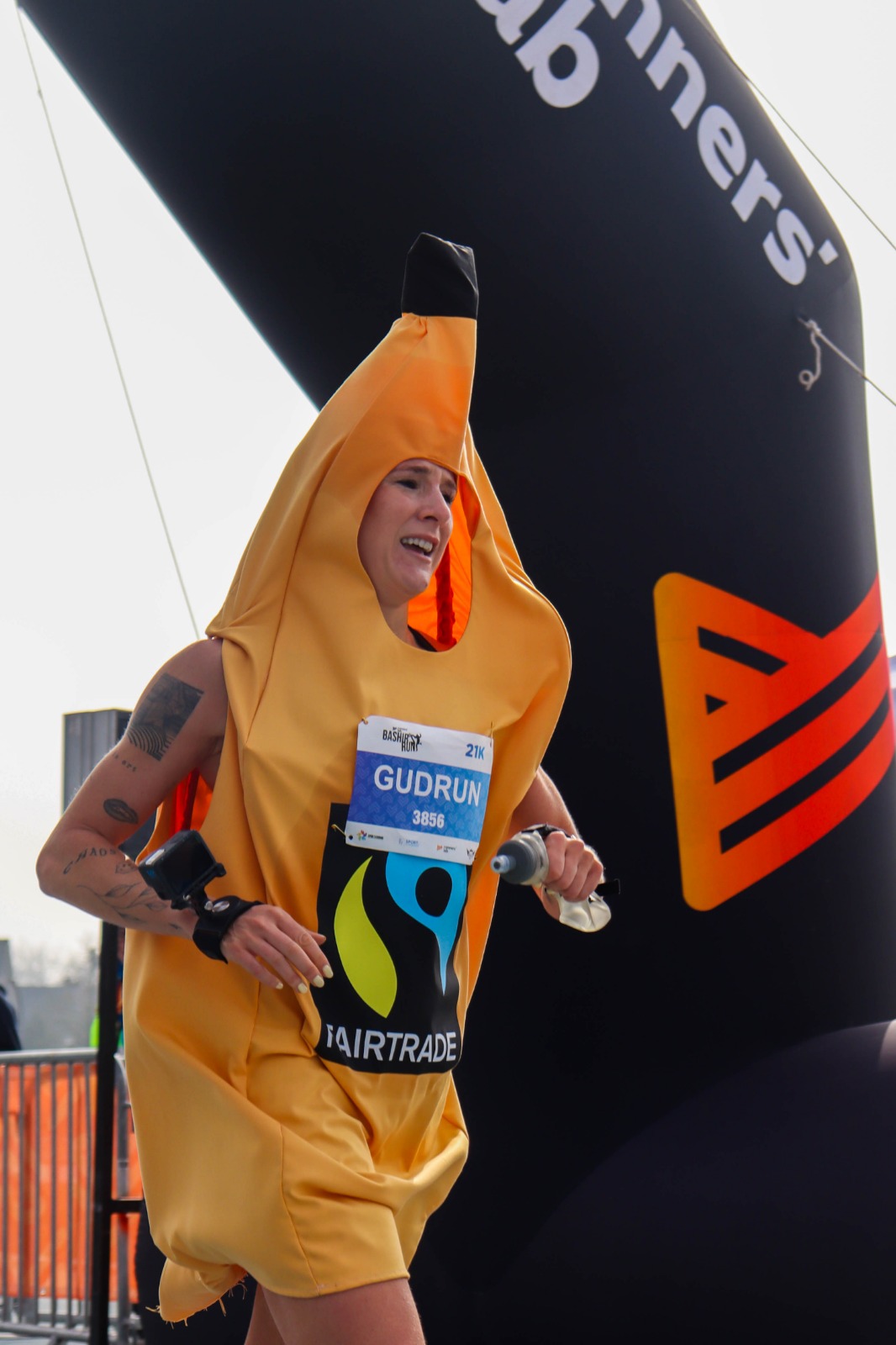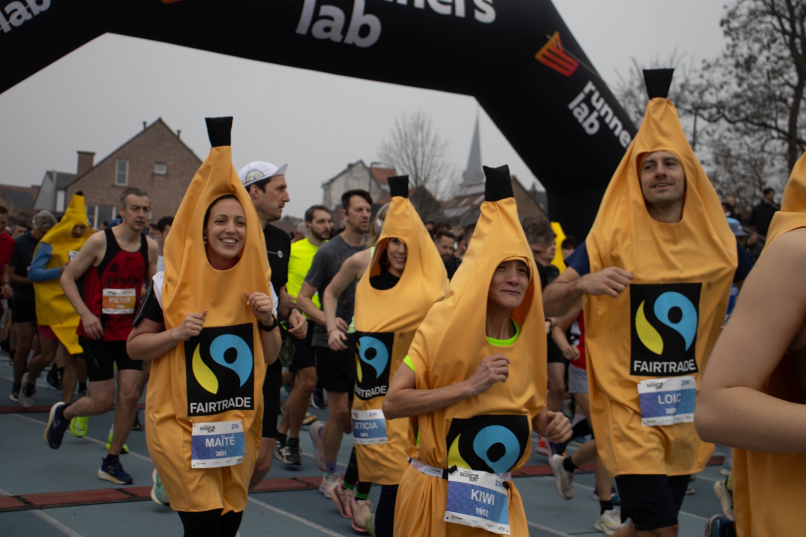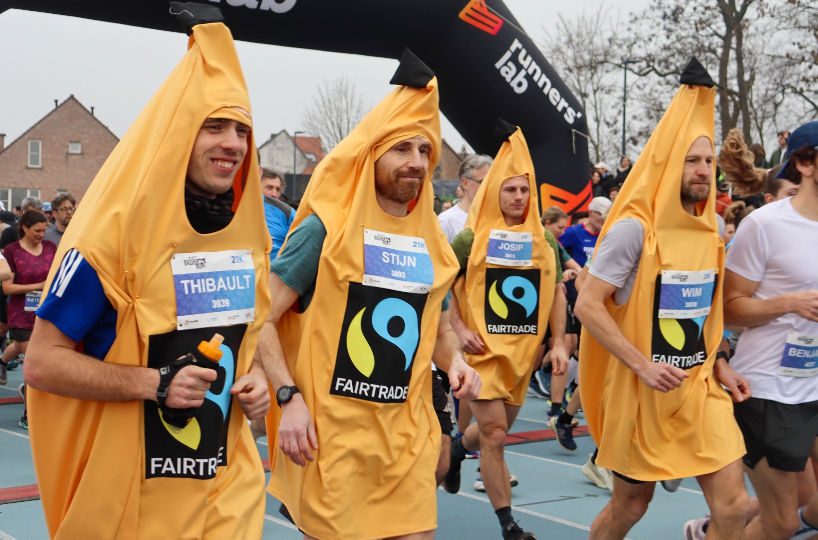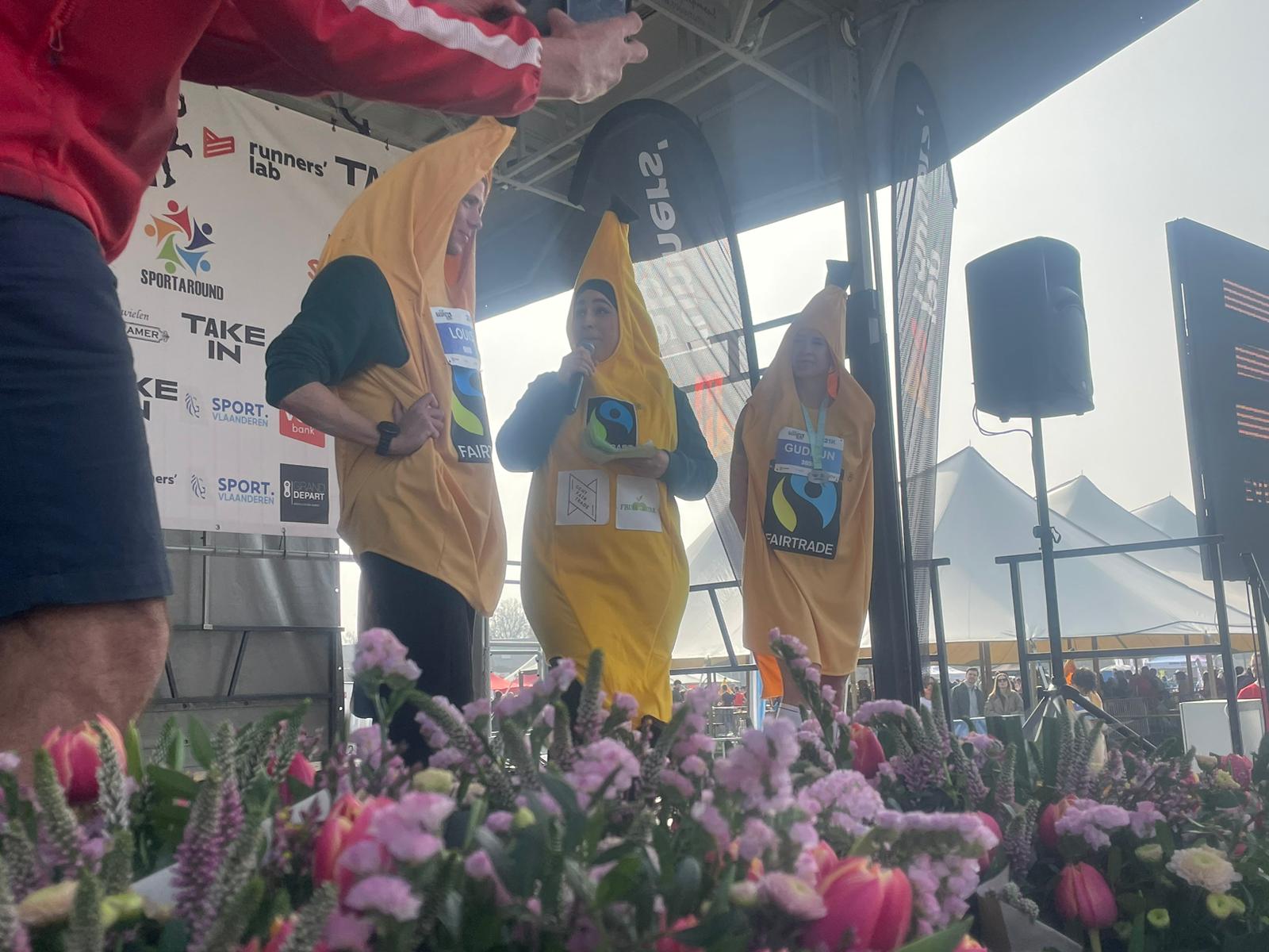 Op de Bashir’s Run in Gentbrugge was het vanmorgen uitkijken naar een unieke wereldrecordpoging: de snelste halve marathon ooit verkleed in een stuk fruit. Organisatoren Gent Fair Trade en Fairtrade Belgium trommelden met Louis Misplon en influencer Gudrun Hespel twee kanshebbers op om in Fairtrade bananenpak het WR bij de mannen en vrouwen te verbreken. En ze hielden zich aan hun belofte: Misplon en Hespel verpulverden de recordtijden, tot voordien 1:15:35 en 1:48:36. In totaal stonden meer dan 40 Fairtrade bananenlopers aan de start, waaronder ook influencer Samuel de Graef.